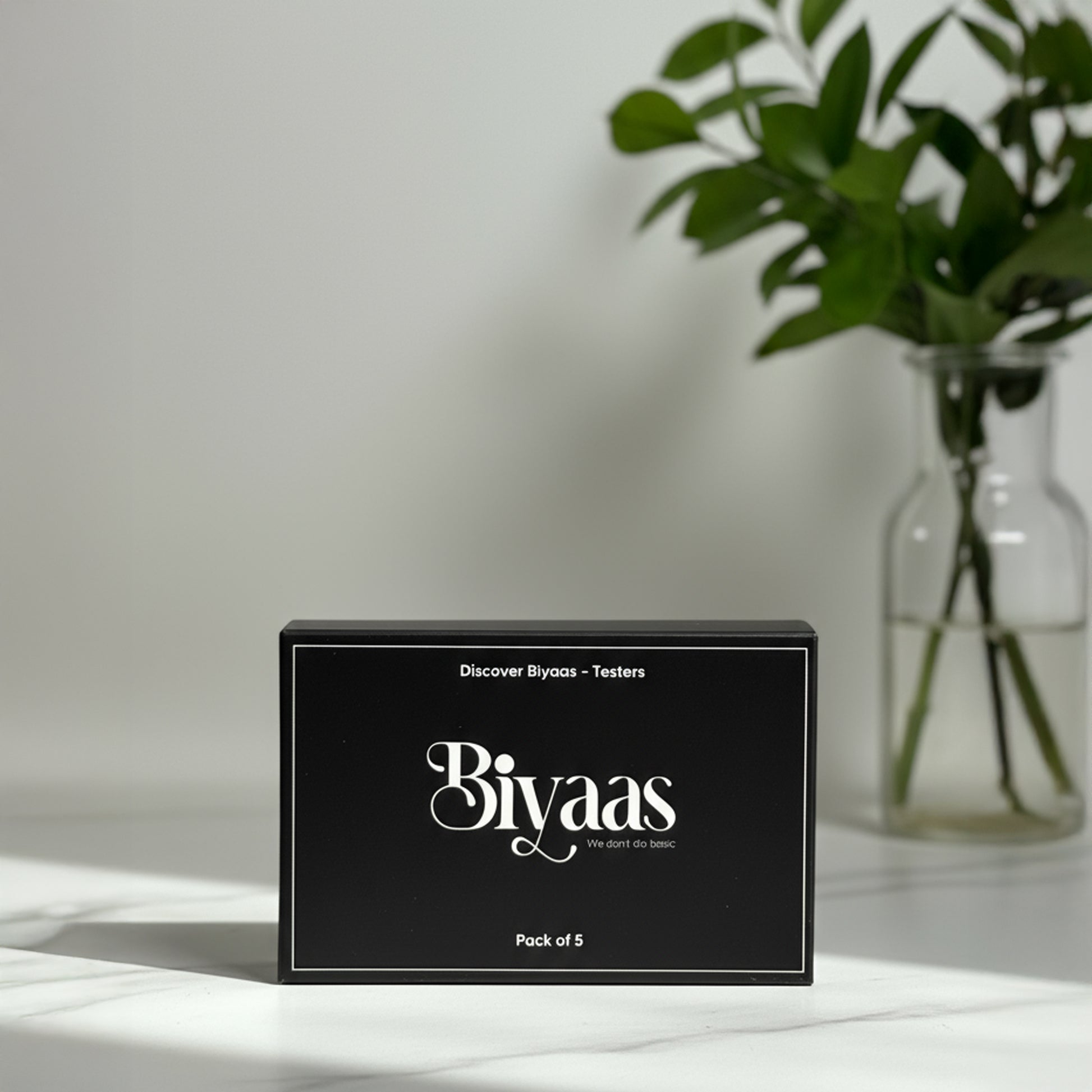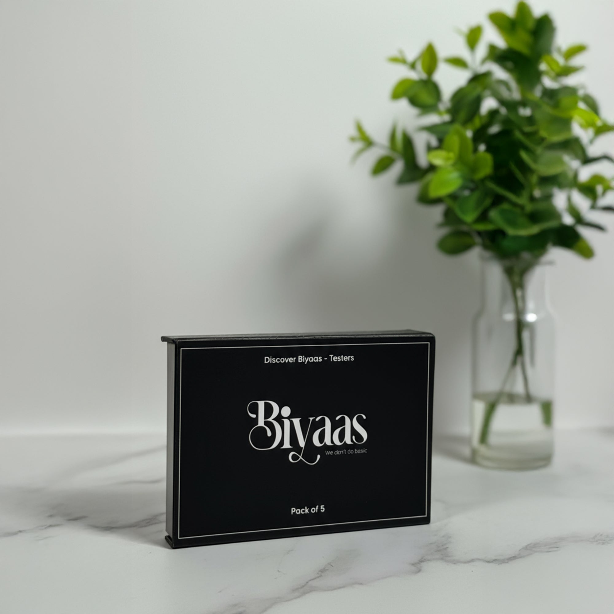 Experience the luxury of Biyaas perfumes in a convenient 5ml tester pack. This exclusive box includes 5 handpicked fragrances to help you explore and find your perfect match. Whether you’re trying them for the first time or need compact travel-friendly options, this tester box is your gateway to Biyaas’ world of premium scents.